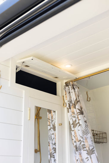 Also creating an extra couch area up front was a game changer for this build. The front passenger seat was removed and a little reading nook was created, whilst still allowing access beneath it for the engine bay, fuse box and washer wiper bottle. A styling concept of a barn was decided upon early on, but with a more high end finish. We opted for French oak wide planks for the ceiling and rear cabinetry, and black shaker cabinet lowers with complimentary white shaker uppers to lighten the visual space at eye level. A mixture of brass and black hardware contrasts wonderfully with the black and white cabinetry, liming white stained countertop and Tasmanian oak trim, and those timber look tiles!!
