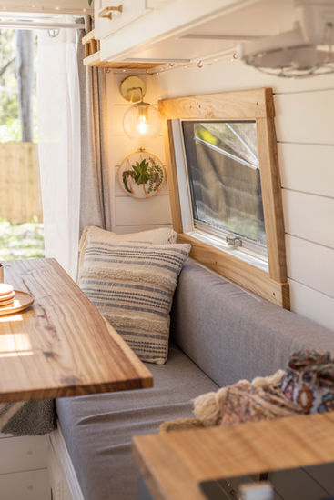 A dining room that converts into a double bed was a non-negotiable for Renee. The comfort of sleeping couldn’t compromise the ability to host a dinner party or social gatherings. Renee’s got style, and she wanted the same with her van. Beautiful tiled backsplash and a complimenting brick wall, a rustic barn door on the shower, clean white timbers and Hamptons style furniture and hardware, this van could be on the cover of a glossy magazine.