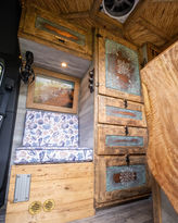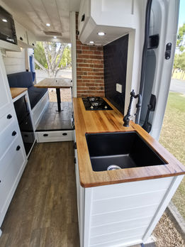 Louisa has started a new business and can work from the road, so this van also must be a home office, and natural light was high on the agenda. Lots of windows, skylights and bright fresh cabinetry make being inside this van a joy, no matter what time of day it is. The camphor Laurel timberwork, and brass hardware give this van a subtle luxury vibe without being too pretentious. And with a huge 200ah lithium system, toilet, shower and gas cooking, Louisa can now work wherever she wants....when she's not being distracted by the beautiful views from those windows.